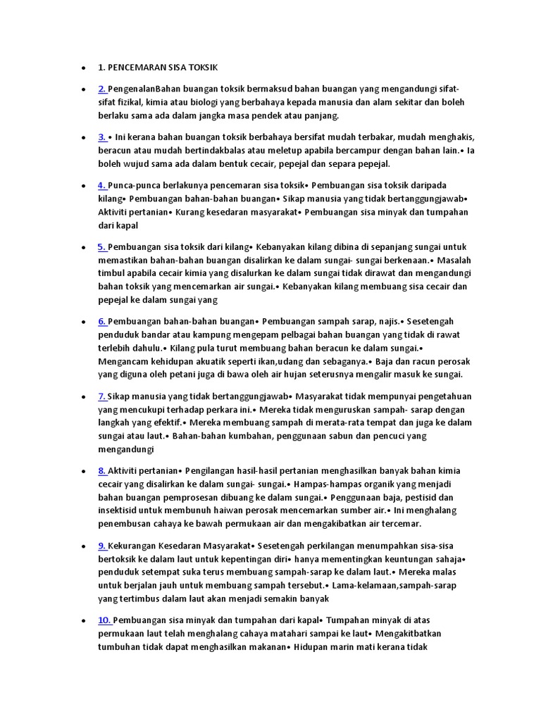 Salah satu cara yang dapat dilakukan untuk menangani pen. Negara kita dikejutkan lagi dengan insiden pembuangan sisa toksik yang telah di lepaskan di aliran sungai Kim-Kim dan di beberapa lokasi di Pasir Gudang yang mana telah memberi impak yang signifikan dalam kalangan komuniti di Pasir Gudang. Racun boleh menyebabkan kesan yang boleh membawa maut dan kehilangan habitat kepada kehidupan haiwan.